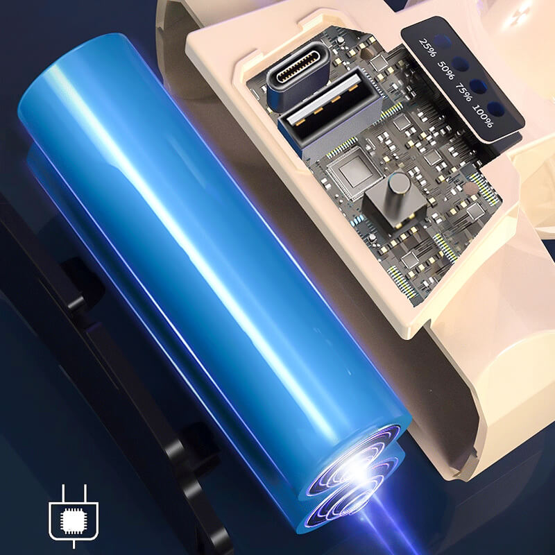 Power Display - The headlamp features a four grid dazzling blue light power display that allows you to easily check the power level of the battery. When the battery is fully charged, the indicator lights are all on and when it is charging, the indicator lights will be flashing. When the remaining 25% of the battery is used, it is important to charge it in time to avoid damage to the battery.